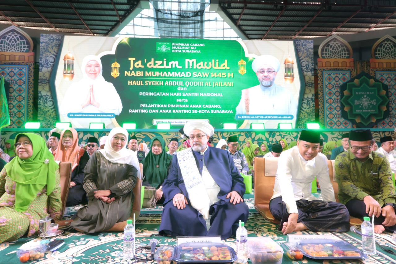 hariansurabaya.com | SURABAYA – Calon Gubernur Jawa Timur Khofifah Indar Parawansa dan Calon Wali Kota Surabaya Eri Cahyadi kompak hadir dalam kegiatan Ta’dzim Maulid Nabi Muhammad SAW 1445 H dan Haul Syekh Abdul Qadir Al Jailani yang digelar PC Muslimat NU Surabaya di GOR Bung Tomo Surabaya, Minggu (3/11/2024).