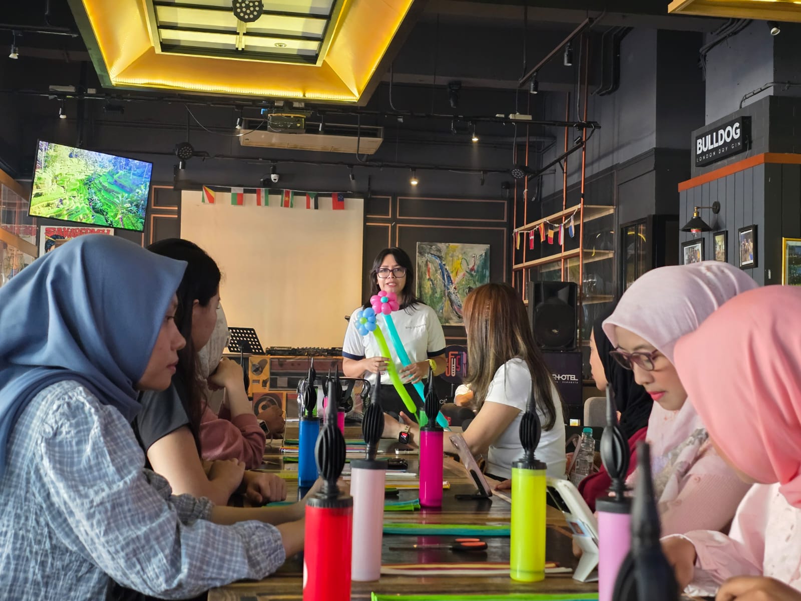 Suasana workshop berlangsung hangat dan penuh keceriaan. Terdengar suara gesekan balon yang diputar, sesekali disusul letusan yang memecah keheningan, lalu diiringi gelak tawa para peserta. Meski santai, para peserta tetap serius mengikuti setiap instruksi demi menghasilkan karya terbaik.